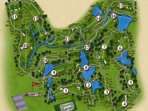 ドライビングレンジ、パッティンググリーン、クラブハウス、4つのレストランと施設も揃っている。